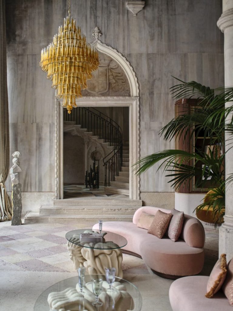 Affreschi ottocenteschi dialogano con forme scultoree moderne, i celebri “Colori Persi” di Venezia tornano a splendere in tessuti preziosi, velluti avvolgenti e marmi lavorati a mano. Il cortile a cielo aperto si è trasformato nella maestosa Corte del Conte, salotto glamour illuminato da spettacolari lampadari su misura in vetro di Murano. Il giardino segreto, nascosto per secoli, è oggi un’oasi incantata con fontana sontuosa, tende eleganti e lanterne veneziane che diffondono una luce calda e avvolgente. Ogni dettaglio – dalla scala ottagonale neogotica alla volta celeste – racconta un restauro che eleva la storia a vera opera d’arte.